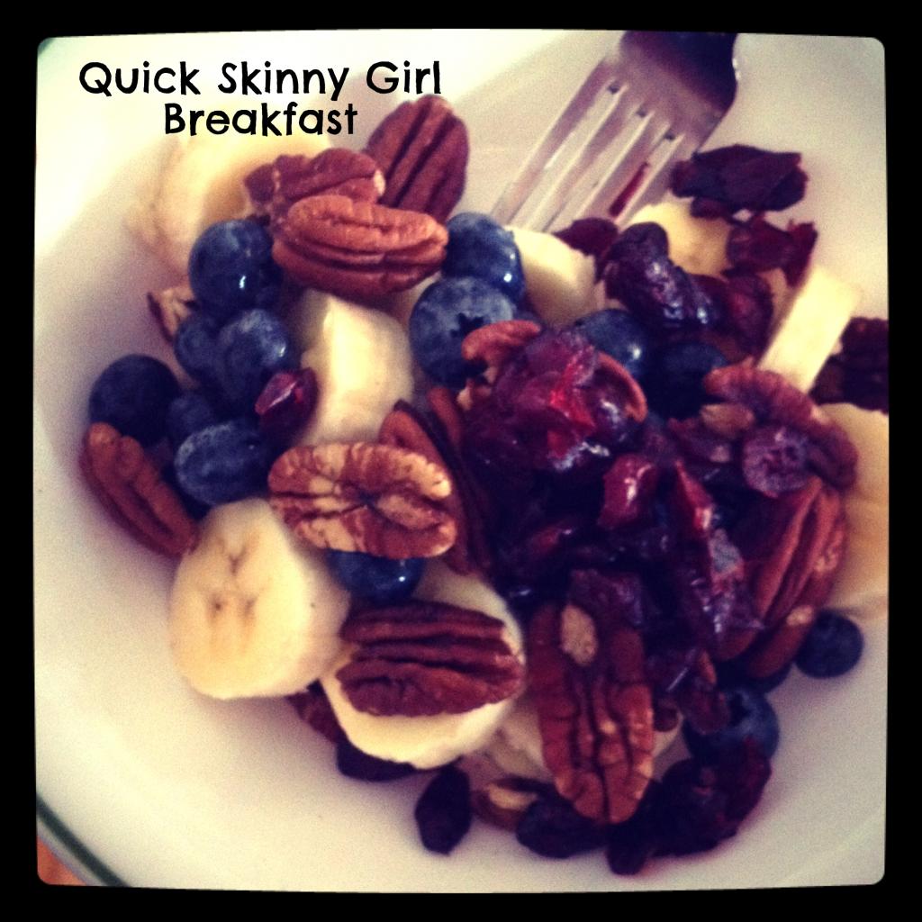 First: cut up 1 banana; add a handful of blueberries, 10 walnuts and coat it with a pinch of chia seeds. You can also add a dash of cinnamon for flavor. (This will help your metabolism).