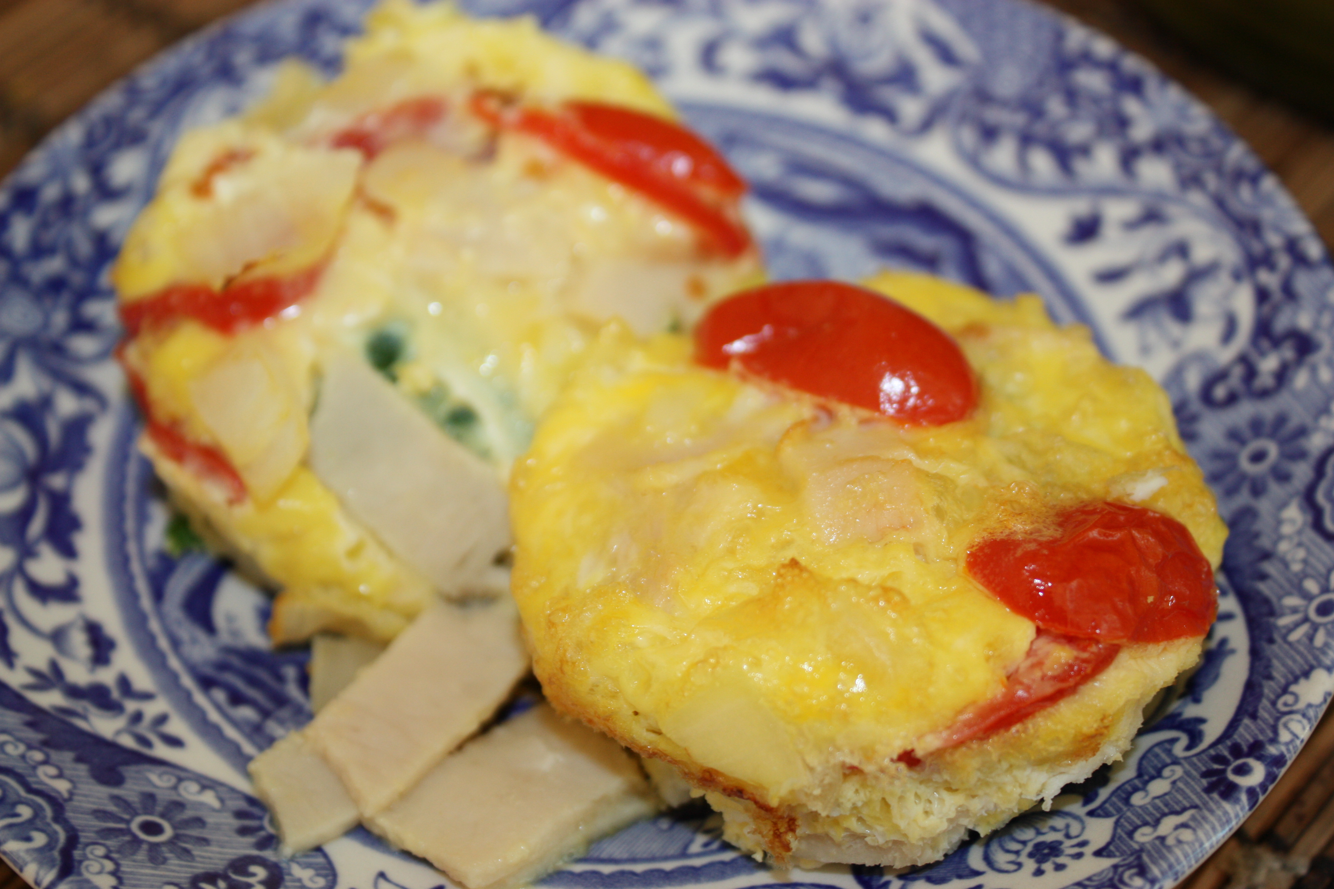 In muffin tins, line the bottom with about 3 spinach leaves. I lined 6 little cups in the tin. Add some sliced turkey meat and sliced tomatoes.