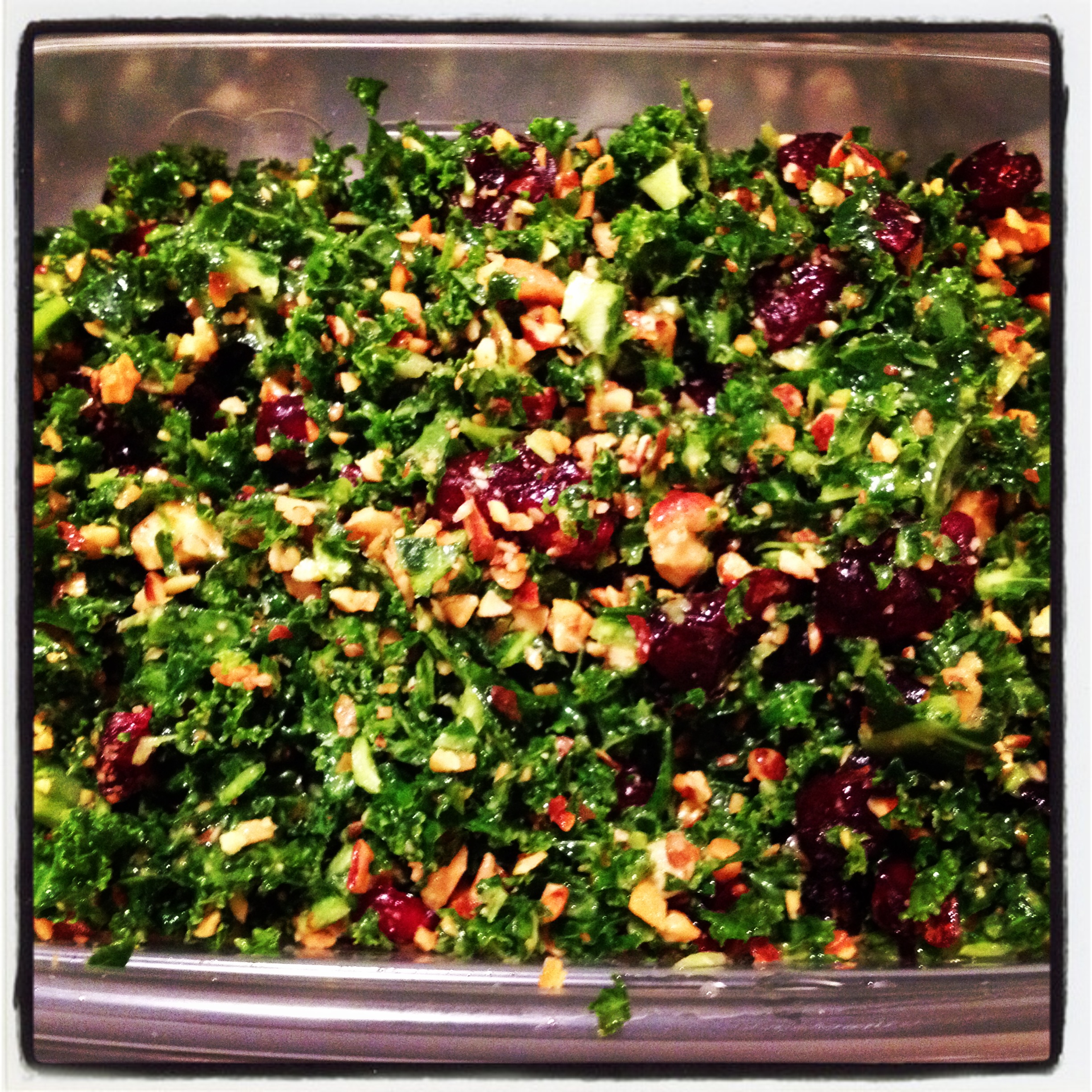 You will need: 2 cups of kale, 1 handful of sliced almonds, ¼ cup crasins, 2 tbsp. olive oil, 1 cap full of apple cider vinegar and 2 tbsp. fresh lemon juice.