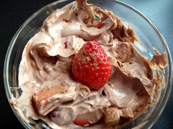 You will need: 1/2 cup 0% fat Greek yogurt (70 calories), 1 tbsp. cocoa powder (30 calories) and 3 big chopped up strawberries (13 calories).