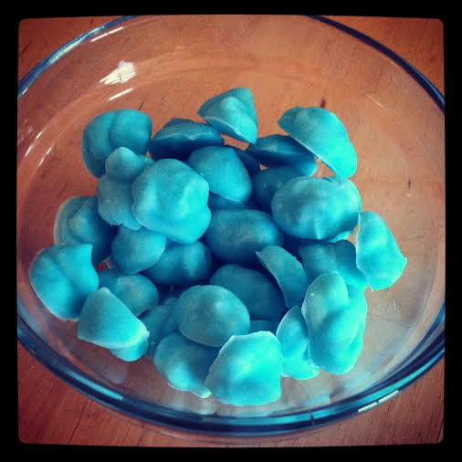 Once the dots are frozen, use a spatula to get them off the pan and place them in a nice little bowl for others to enjoy.