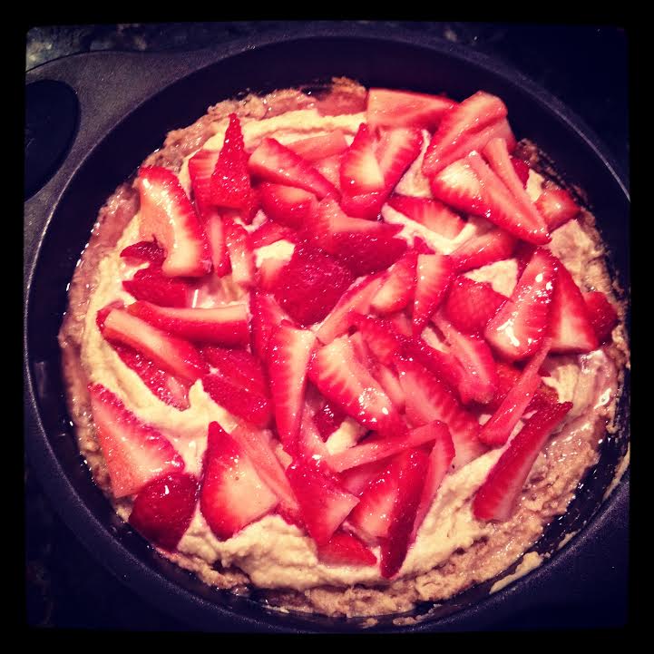 After your crust is set, spoon the cashew mixture on top of the hard crust. Next dump your cooled strawberry mixture on top of the creamy topping. You are done – a raw, gluten free strawberry tart. It’s rich and awesome. Enjoy.