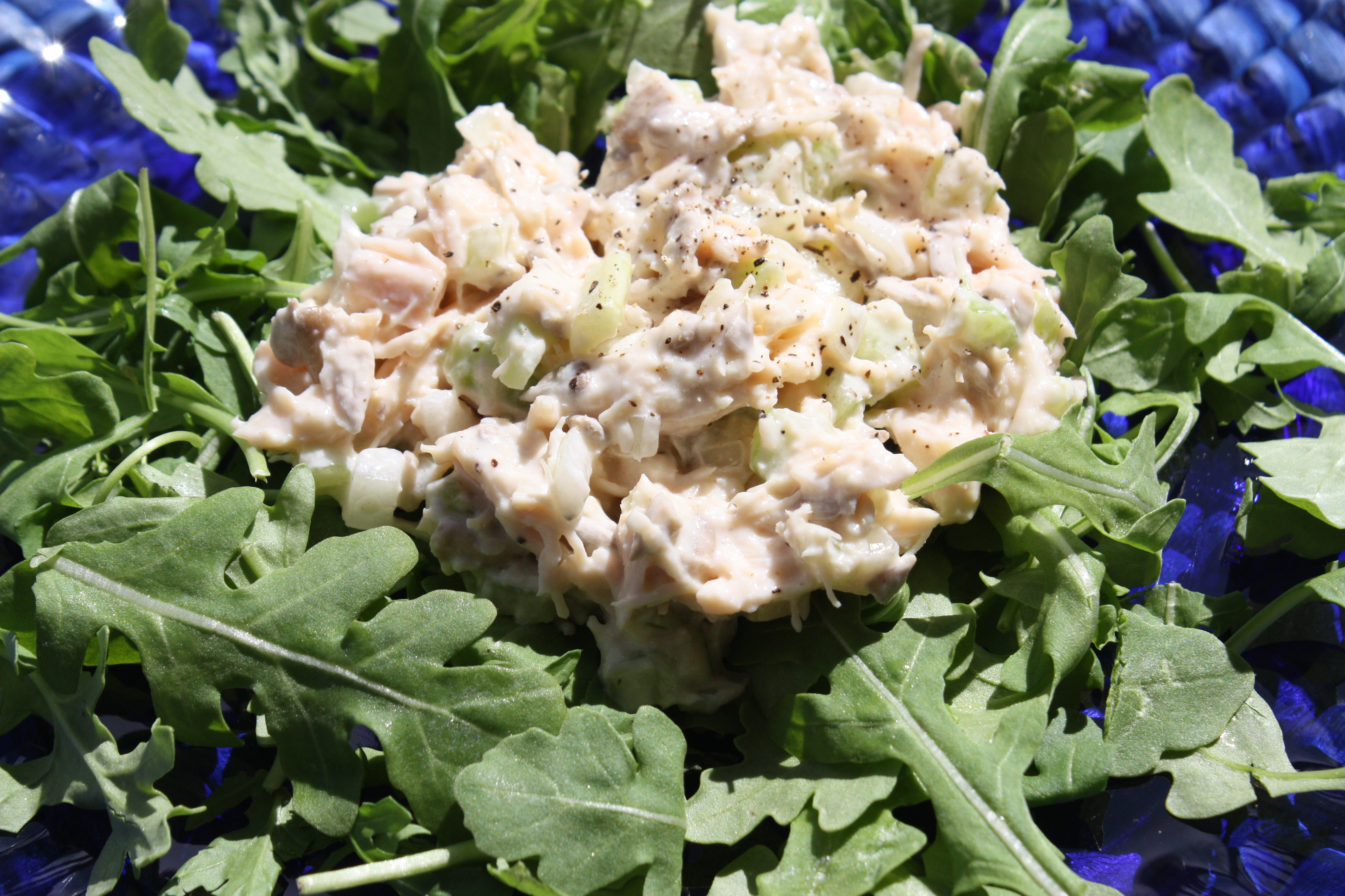 You will need: 1 can of chicken (or you can use 2 whole chicken breasts – cooked and chopped), 3 large celery stalks, ¼ yellow onion, salt and pepper, 1 tsp. garlic powder, ¼ cup raw sunflower seeds, 3 tbsp. mayonnaise and arugula leaves.