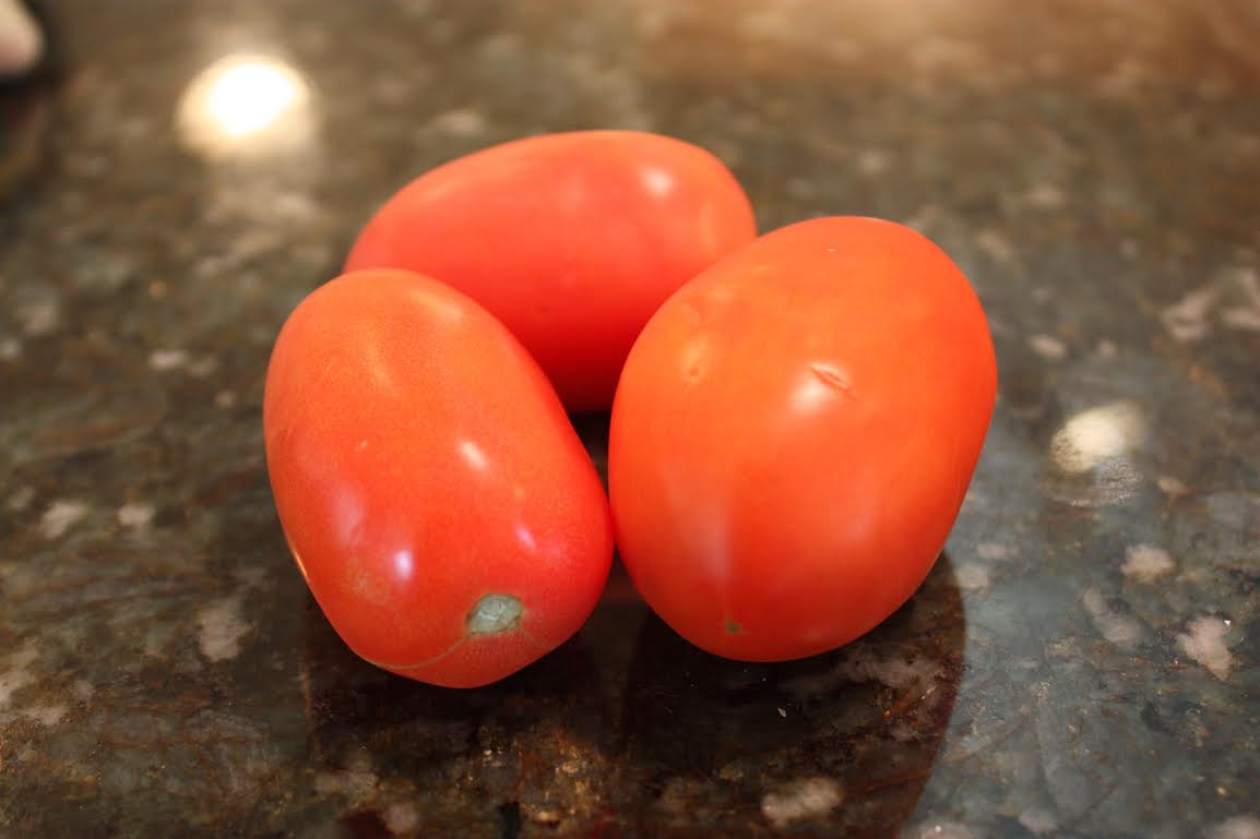 All you need to do is – get out a cutting board and chop up your pretty tomatoes. You can chop huge chunks or little chunks. The choice is really up to you.
