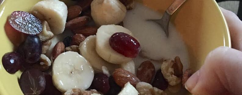 You will need: 1 banana (chopped), 12 grapes (halved), 1 handful of almonds, 1 handful of walnuts and 1 cup – or ½ cup of coconut milk.