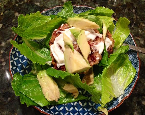 On the skillet, pour the olive oil into the frying pan. Form little patties with the meat. And cook your patties for about 5 minutes or until golden in color. Yum – a Texas Turkey Burger! Wrap in romaine lettuce for bread.
