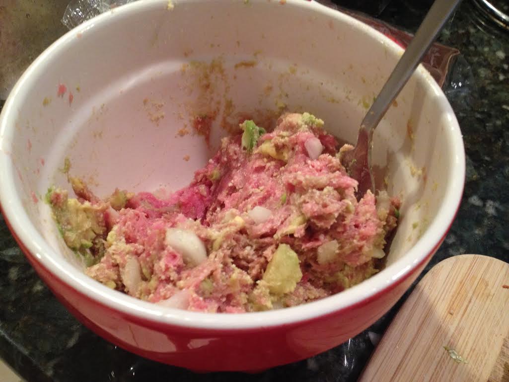 All you need to do is dump the ground turkey (thawed out, if frozen) into a mixing bowl. Chop your onions up in tiny pieces and add them to the meat mixture. Then add chunks of chopped avocado to your mixture as well. Use a fork to mash up the blend.
