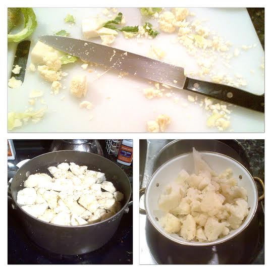 First, boil a big pot of water. On a chopping block cut your cauliflower into tiny little florets. Place these florets in the water (after it comes to a boil). You will want to boil these pieces for about 10 minutes.