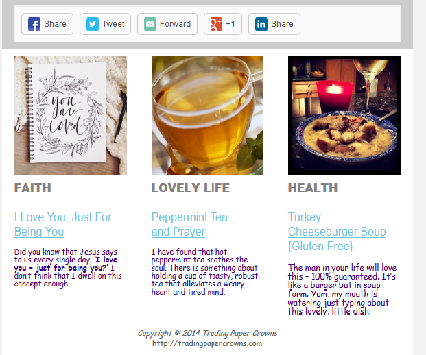 You can get yummy recipes, decorating ideas, spiritual encouragement and health tips sent directly to your little inbox! What a joy! You can simply forward these e-mails to friends and family members – because sharing is caring.